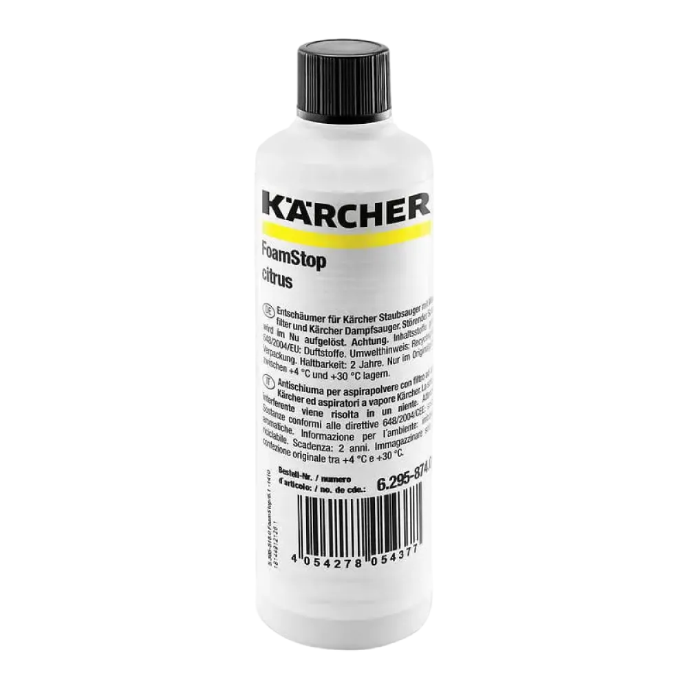 Lichid împotriva spumei cu parfum anti-alergenic de citrice Karcher, 125 ml — un produs special conceput pentru suprimarea eficientă a spumei în timpul curățării cu soluții de spălare. Potrivit pentru aparatele Karcher destinate uzului casnic și profesional.